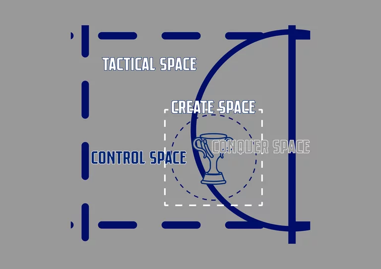 Der eigene Raum wird kontrolliert und final erfolgreich aufgelöst. Das definieren wir als das Beherrschen (Conquer) der geschaffenen Spaces. Mit dem Erfolg in diesen situativen Teilräumen kommt es zum Gewinn der taktischen Räume und der Verbesserung der eigenen Feldposition bis hin zum Torerfolg. Wer seine Räume beherrscht, gewinnt das Spiel.